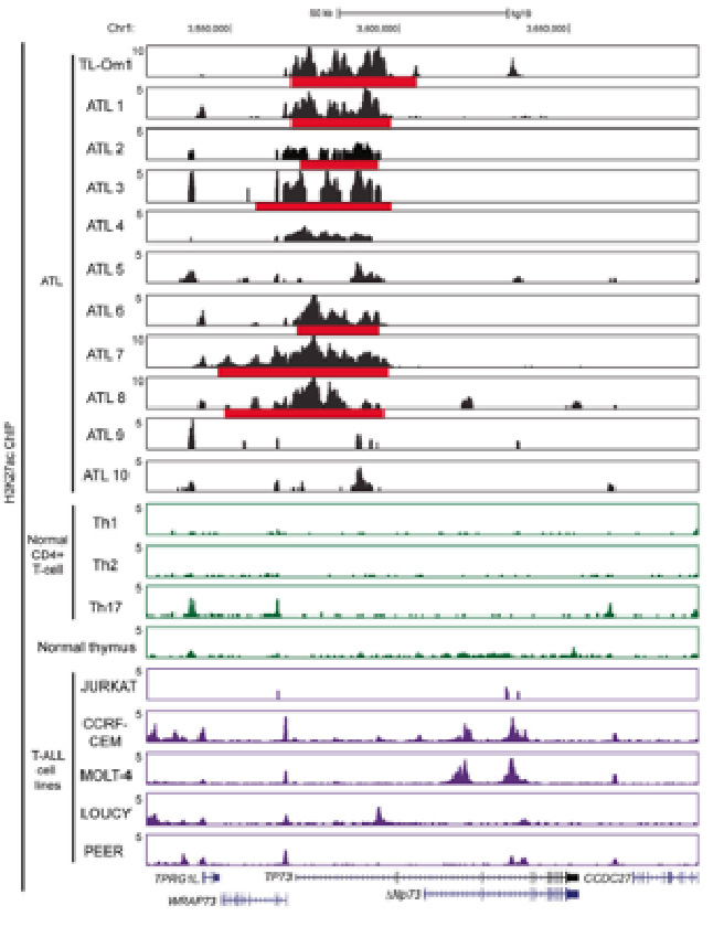 います。さらには、TP73の構造異常が成人T細胞性白血病の予後と相関することを