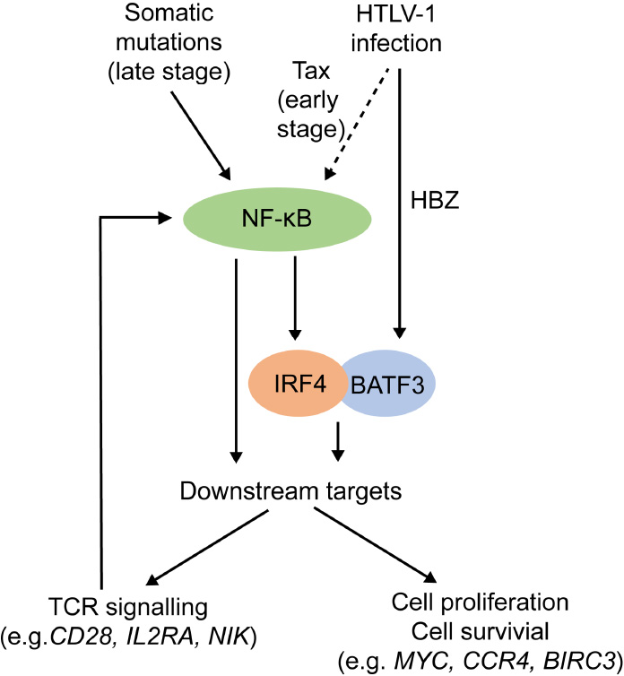 においては、上流シグナル伝達経路分子の遺伝子変異やレトロウイルスHTLV1の